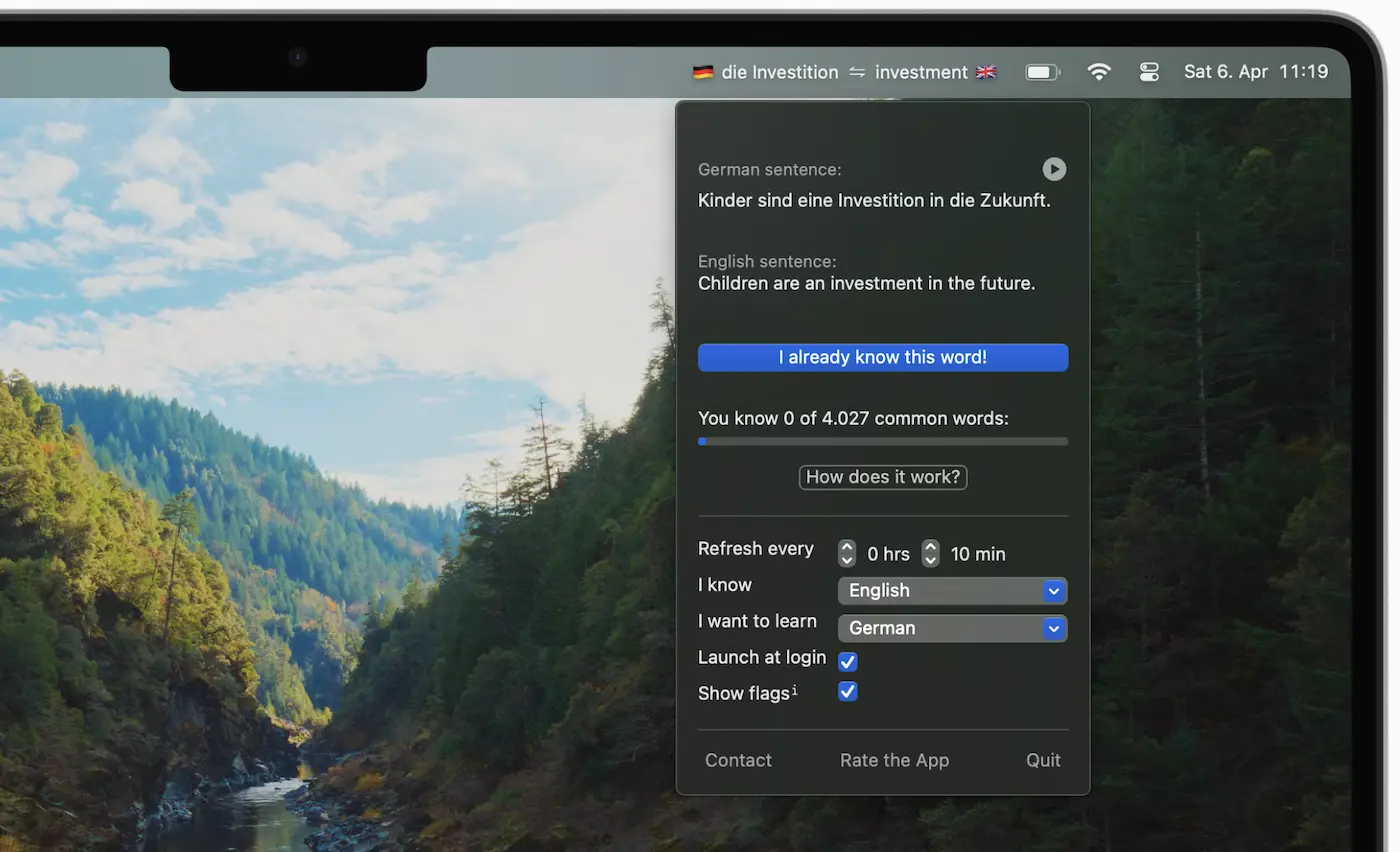 Memorize the most common words in your target language with the spaced-repetition technique on the Menu Bar of your Mac.